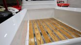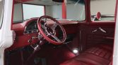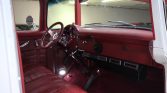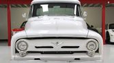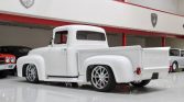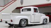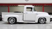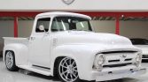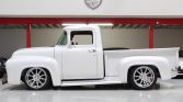 1956 Ford F-100 in White over Red Leather Interior. Equipped with a 350ci Tune Port Injected V8 Engine mated to a 700R4 Automatic Transmission. This beautiful restomod pickup has been updated with Power Steering, Power Disc brakes front and rear, Vintage Air A/C, Lanzar AM/FM radio with Bluetooth, VHX instrument cluster, Tilt steering column, Custom interior with beautiful dark red upholstery, 20″ Ridler wheels, Jaguar rear end with IRS, Roll pan, Wooden bed, Headers with custom exhaust, Louvered hood, and more! The truck runs and drives great and turns heads everywhere it goes.