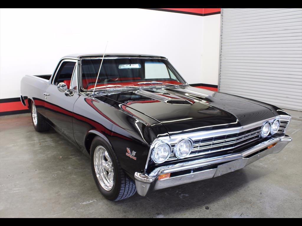 1967 Chevrolet El Camino in Black over Red Custom Interior. Equipped with a 427ci V8 Engine mated to a TH400 Automatic Transmission. California black plate car, it has spent it’s entire life in the foothills of Northern California. Fresh engine build from Doug’s Speed Shop with less than 1,000 miles on it. Engine is making around 500hp. Balanced and blueprinted. Racing pistons. Edelbrock Performer aluminum heads. Hydraulic lifters. MSD ignition. Be Cool radiator with electric fans. B&M shift kit with billet electronic kick-down. Both the original Turbo 400 Transmission and 12-Bolt rear end have been recently rebuilt. Factory Air Conditioning has been updated and blows cold. Baer disc brakes. Hotchkis adjustable 4-link rear suspension. Power steering. Pioneer CD player. Autometer gauges. A very high quality build; the body is straight, it was rust and dent free before restoration, original floors and bed, the PPG paint is beautiful, the doors shut excellent, windows roll up and down with ease.