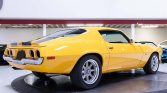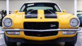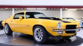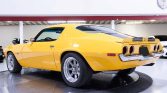 1973 Chevrolet Camaro Restomod in Yellow w/ Black Rally Stripes over Black Interior. Equipped with a built 468ci V8 mated to a Tremec TKO 600 5 Speed Manual Transmission. This incredible Camaro had a ground up restoration including all new glass, interior, paint, and brightwork. Features include: Bow Tie 454 Block, Dart Pro 1 Heads, Roller Cam & Rockers, Edelbrock Intake, 750 CFM Holley Carb, MSD 6al, Hooker Headers w/ 3″ Exhaust, Curry 9″ w/ 4.11 Gears, Flaming River Steering Column w/ Quick Ratio Steering Box, CPP 4 Wheel Disc Brakes, Speed Tech Suspension w/ Coilovers, 3 Core Aluminum Radiator, Vintage Two Piece Wheels wrapped in Brand New Nitto Tires and more!